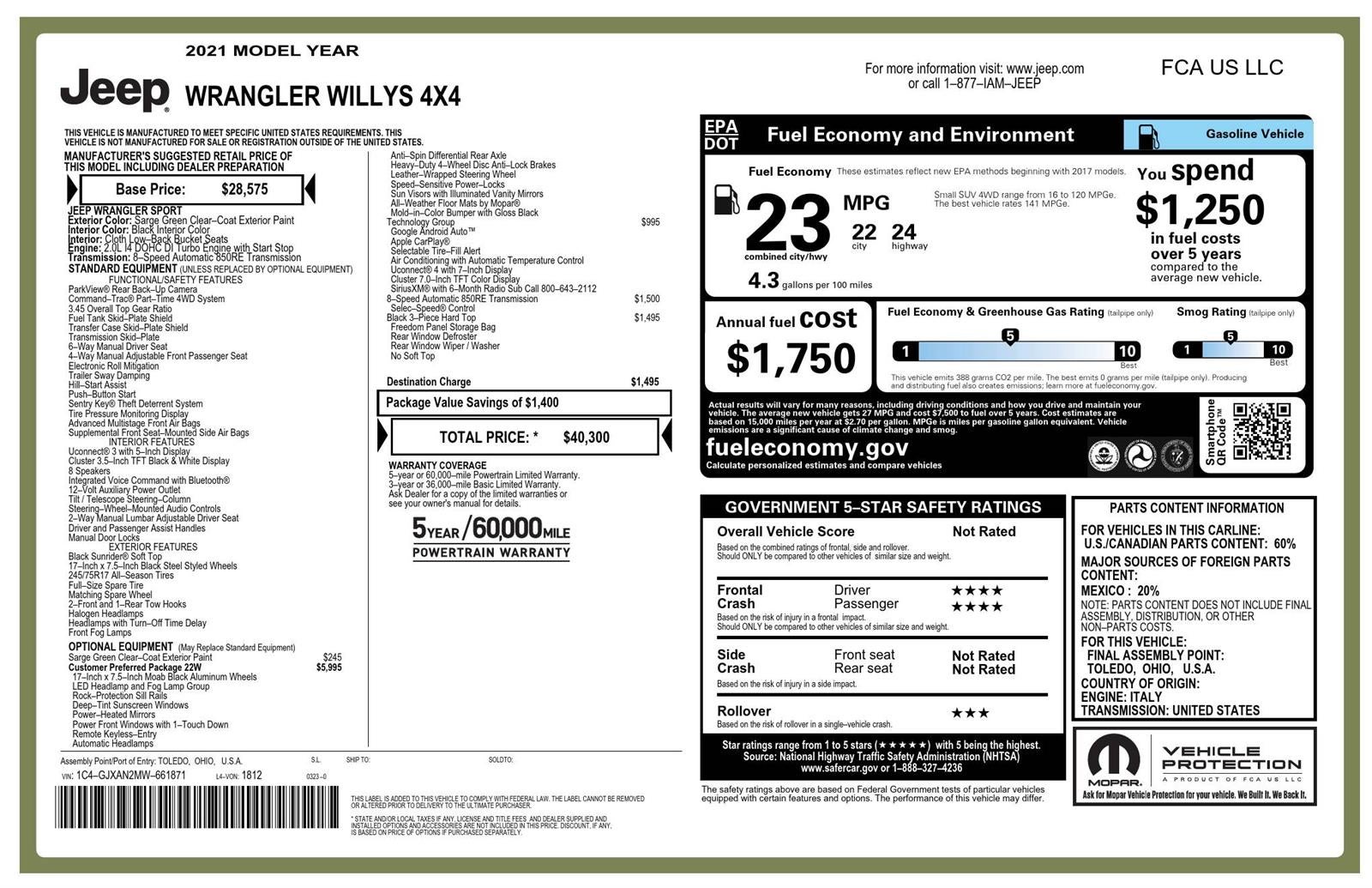 One Owner!**CUSTOMER PREFERRED PACKAGE 22W** ($5,995 ADD TO MSRP), **8-SPEED AUTOMATIC 850RE TRANSMISSION** ($1,500 ADD TO MSRP), **BLACK 3-PIECE HARD TOP** ($1,495 ADD TO MSRP), TECHNOLOGY GROUP, 2.0L, 8-SPEED AUTOMATIC 850RE TRANSMISSION, 4WD, KEYLESS ENTRY, PUSH BUTTON START, REMOTE START, 7'' IN SCREEN DISPLAY, UCONNECT® 3, APPLE CARPLAY, ANDROID AUTO, Bluetooth® FOR HANDS-FREE PHONE, LED HEADLAMP, LED FOG LAMPS, POWER-HEATED MIRRORS, BUCKET SEATS, 2-FRONT AND 1-REAR TOW HOOKS, ELECTRONIC ROLL MITIGATION, TRAILER SWAY DAMPING, HILL-START ASSIST, SENTRY KEY® THEFT DETERRENT SYSTEM
