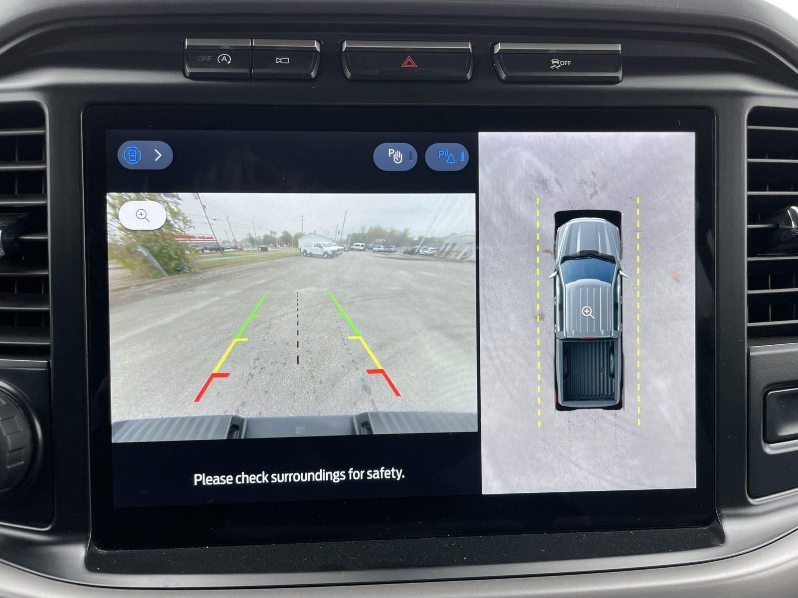 - The vehicle is equipped with a camera that displays an image of the area behind the vehicle on an interior display.